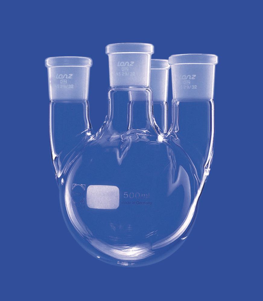 The Lenz-Laborglas Round-Bottom Flask, 500 ml, is a versatile laboratory glassware with four necks. It features a C. neck and side necks (both NS 29/32) designed for use in various chemical and scientific applications. Crafted from DURAN glass, known for its high chemical resistance and durability, this flask is ideal for reactions requiring multiple connections, such as refluxing, distillation, or sampling.